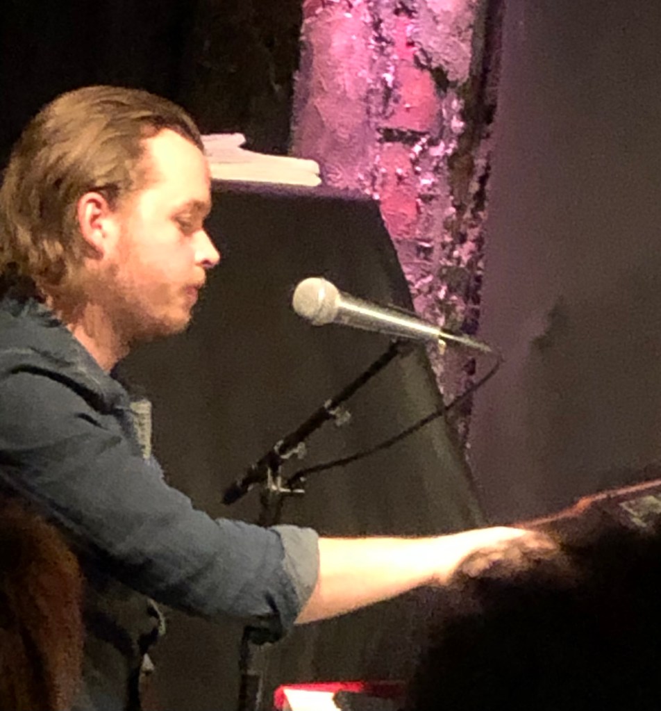 Vegard Hertzeberg varmet opp. Også han med norske tekster. Og meninger! Særlig fint da bandet til Johan kom inn, og Johan selv med stor entusiasme spilte andrefiolin.