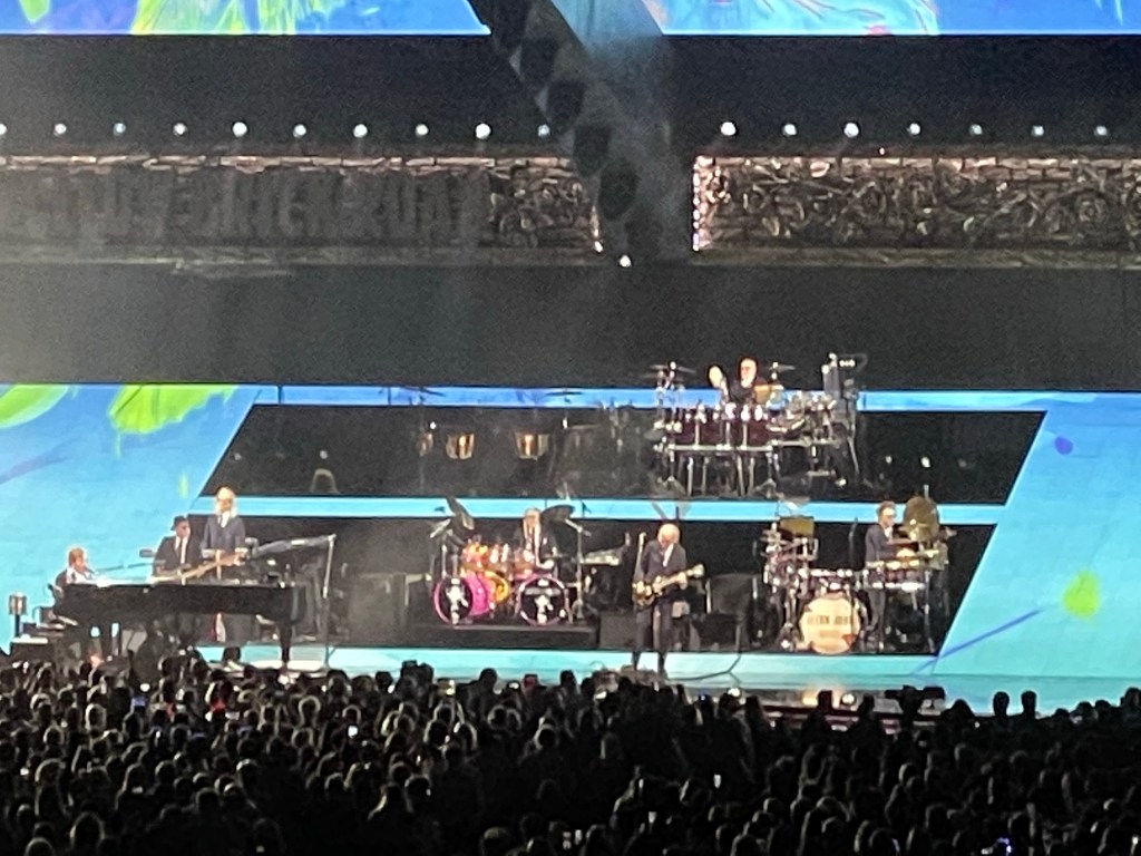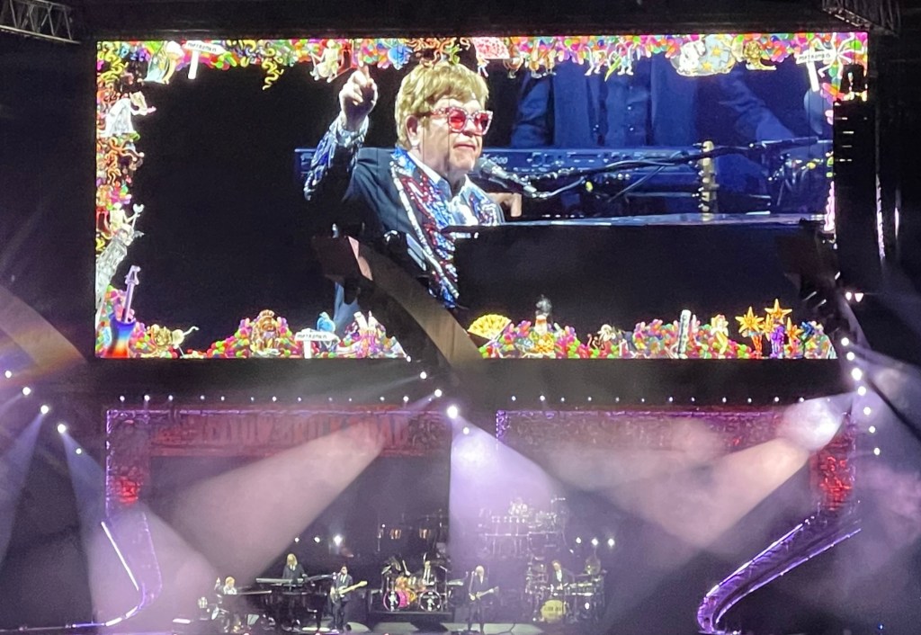 Du som leser dette, skal vite at omtalen er skrevet av den irriterende fyren som gjerne vil ha de mest kjente favorittlåtene, og der deeper cuts ikke gjør særlig inntrykk. Denne konserten koblet jeg meg ikke på før i låt nummer tre, «I Guess That’s Why They Call It The Blues». Et par låter seinere kom imidlertid én låt jeg ikke hadde et forhold til, men som likevel satt som ei kule med et herlig band og en Elton John i storform. Det var flere låter på konserten som jeg egentlig ikke liker, men når man på storskjermen kan følge Elton Johns herjinger med pianoet, og gitaristen Davey Johnstones manøvrering av mange ulike gitarer, blir imidlertid også disse delene av konserten fornøyelige. Ja, perkusjonistene, bassisten og mannen bak keyboard briljerte og bidro også sterkt til en flott kveld!