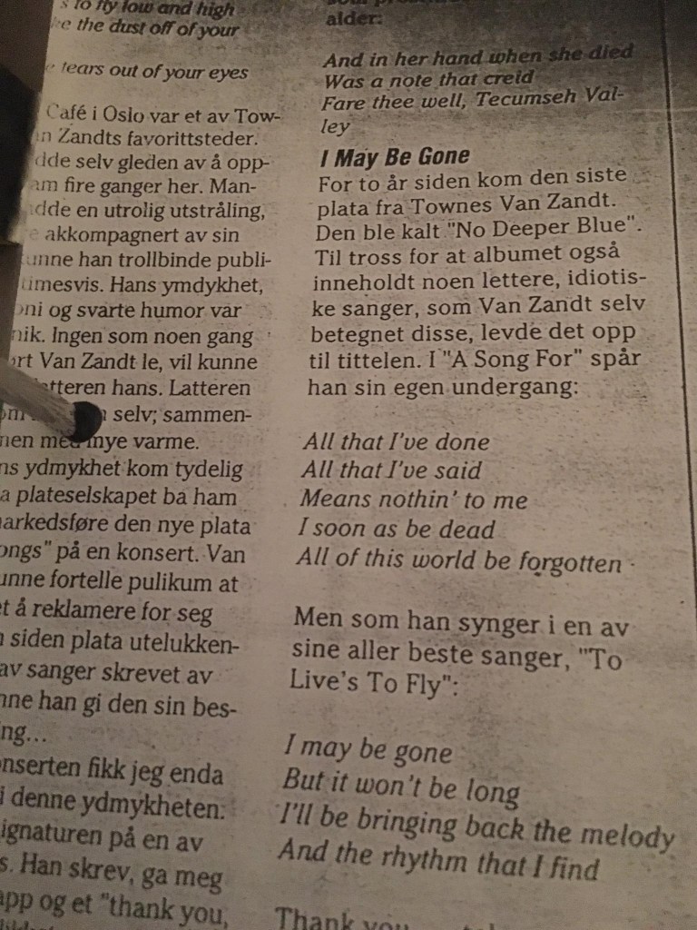 Som noen sikkert har forstått, vender jeg stadig tilbake til Texaspoeten Townes Van Zandt. Her noe jeg skrev for 25 år siden, eneste gang jeg fikk noe på trykk i et musikkmagasin. Arild Rønsen i Puls luket ut noen blundere, i ettertid har jeg fjernet noen faktafeil. Dette fremstår nå som noe naivt og ikke noe jeg ville skrevet slik i dag, men det er umiskjennlig jeg som har skrevet det: