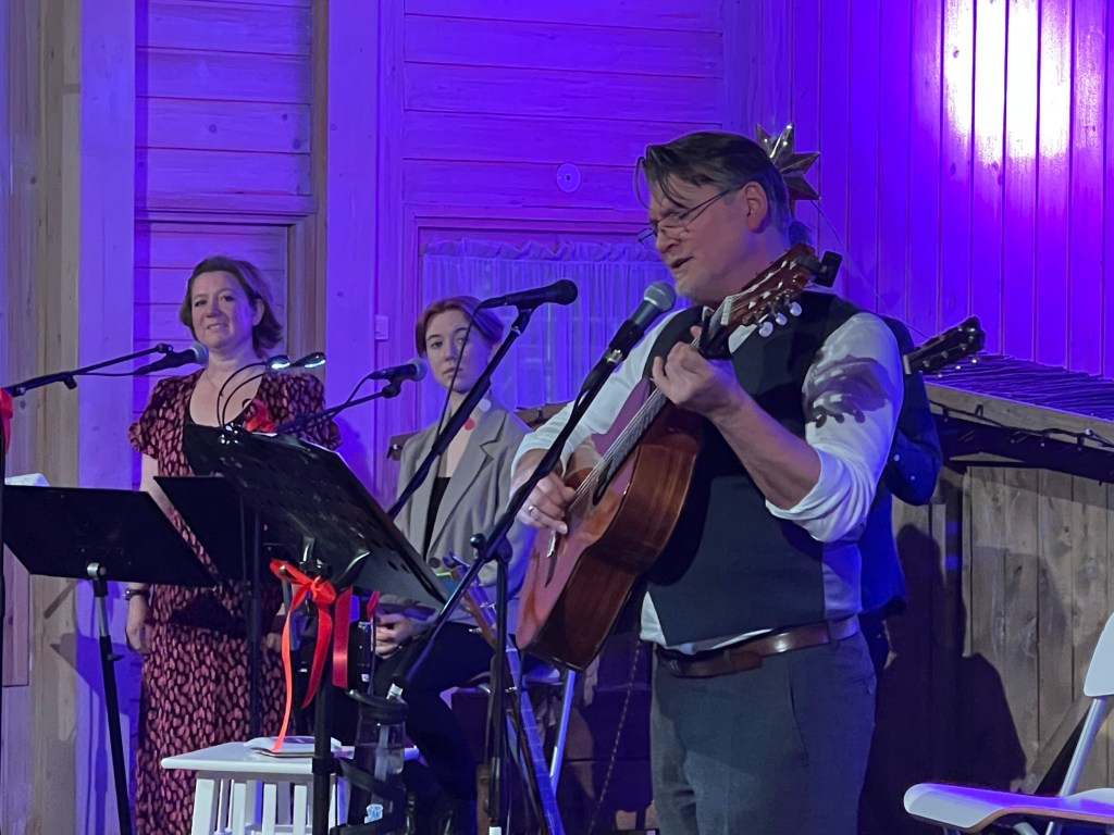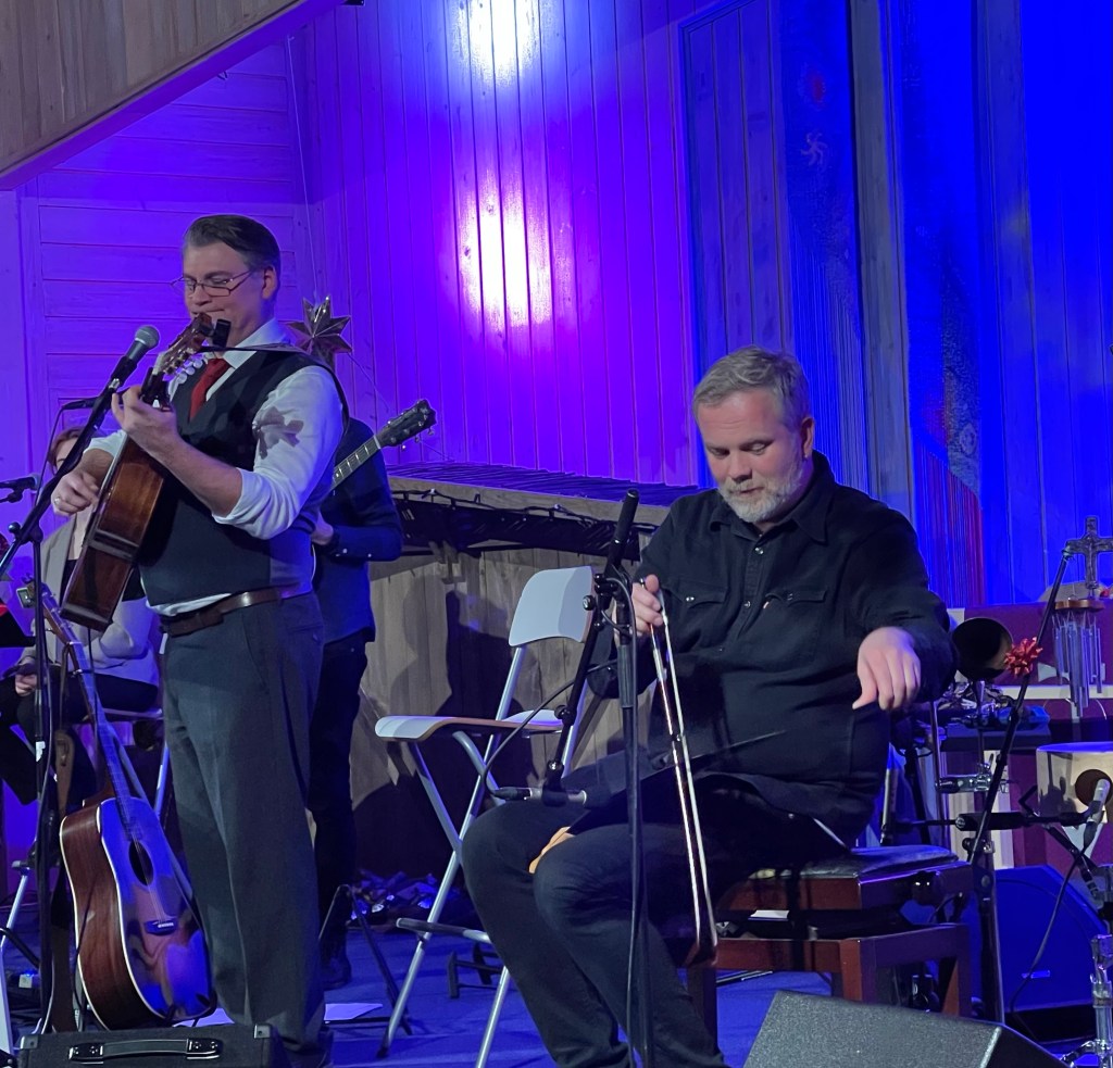 Etter at delen med sanger fra Angelina & Fillefrans var over, spilte perkusjonist og sagfører Øystein Bergsvik og den dyktige trompetisten Øyvind Husebø «O Helga Natt» instrumentalt. Herlig! Redaksjonen var fascinert av denne saga. Deretter fikk vi flere nye sanger. Konserten ble avsluttet på beste måte med «En Gnist», Thomas & Tvilernes egen fine julesalme, og Alf Prøysens «Romjulsdrøm». Så må jeg jo også nevne den fantastisk flotte koringen til Ingrid og Oda Lønnkvist Røri, og helt til slutt kom enda et familiemedlem inn og satte en spiss på det hele. Fra min posisjon så det også ut som om multinstrumentalist Arnstein Arnesen stort sett spilte på gitarer og melodika denne gangen.