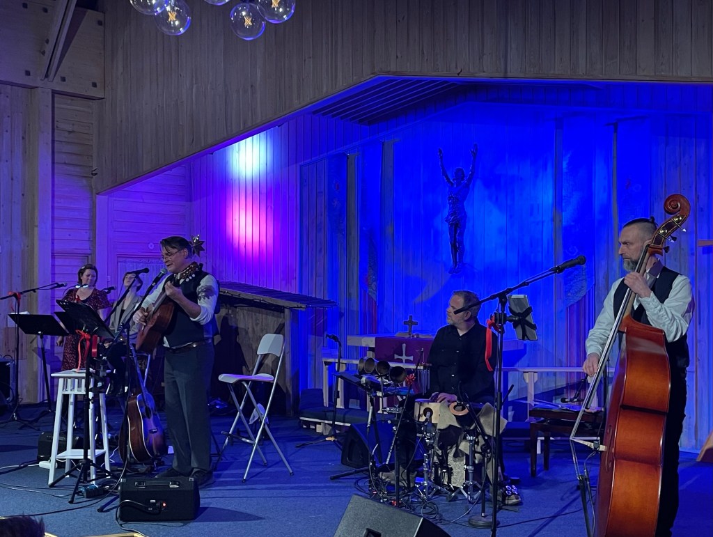 Første del av konserten fikk vi høre låter fra nettopp Angelina & Fillefrans. Den for anledningen styrkede Gubberock-redaksjonen ankom kirken altfor tidlig til tross for snøværet og ufyselige kjøreforhold. Jeg hadde nemlig blingset med en halvtime på oppstart av konserten. Men det gjorde da ingen verdens ting. Vi fikk bare enda bedre tid til å glede oss og la roen senke seg etter den litt strabasiøse kjøreturen. Og så fort konserten var i gang, senket freden seg ytterligere noen hakk. Låtene var valgt ut med stor respekt for kirkerommet, og, som leseren sikkert allerede har skjønt, med et budskap som for meg er helt i tråd med juleevangeliet. Stemningen i kirkelokalet var nærmest andektig, og publikum var særdeles lydhøre for disse fengende sangene som forteller sterke historier.