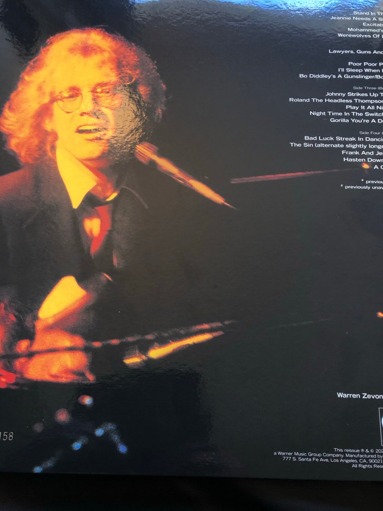 «Mohammed’s Radio», den peneste låten på samlealbumet broren min spilte ustoppelig en periode på åttitallet, får vi i en herlig, og selvfølgelig råere versjon der Warren Zevon nikker mot president Jimmy Carter og hans strev med å få frigitt Irak-gislene. Hiten «Werevolves Of London» er vassere og enda morsommere enn originalversjonen. Her blir «tailor» erstattet av «James Taylor!» og et høydepunkt på låten er jo når Warren synger: «I saw Jackson Browne walking slow down the avenue, you know his heart is perfect!!». Hele tiden svinger det rundt, og på kryss og tvers bak det takfaste pianotemaet. På originalalbumet fikk vi også ultimate versjoner av «Lawyers, Guns And Money» – politisk satire på høyt nivå – samt «I’ll Sleep When I’M Dead» og «Poor Poor Pityful Me»: