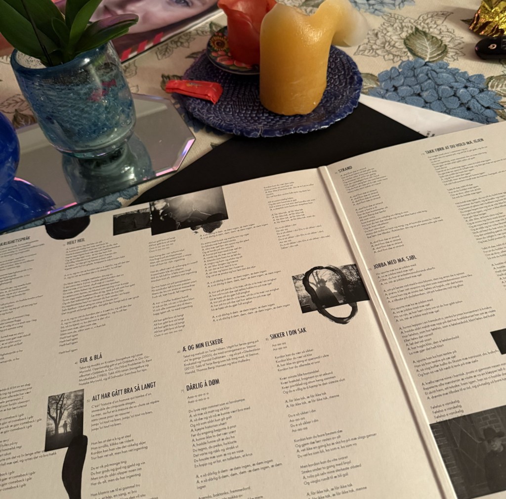 Flere duetter. Jørgen Nordengs stemme er utvilsomt en håndfull, først og fremst en håndfull engasjement og særpreg. Men det gjør intet at stemmen i flere sanger balanseres mot andres vokaler. Den gromme «Kjærlighetsspråk» er allerede nevnt. Nord møter sør når Erlend Ropstad låner tekst og vokal til to andre av mine favoritter på albumet, «Alt har gått bra så langt» og «Takk for at du hold mæ igjen» der rapperen i Jørgen serverer teksten slik du opplever at den må fremføres og der Erlend silkemykt synger sin del. Kjærlighetsspråk, det også. Så må vi ta med den finurlige «Jobba med mæ sjøl» med Anne Rindahl, som ofte ellers på albumet; alvorlig, men med galgenhumor. Det er passende at dette gis ut på Verdensdagen for psykisk helse.